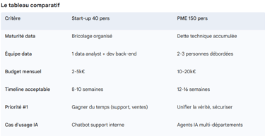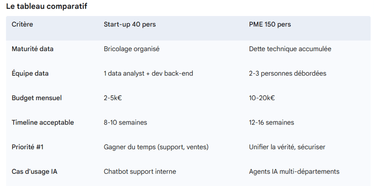 Contexte : Rentable ou proche de l'être. Structure établie. Dette technique data accumulée sur 5 ans. Équipe data de 2-3 personnes en mode "pompier".