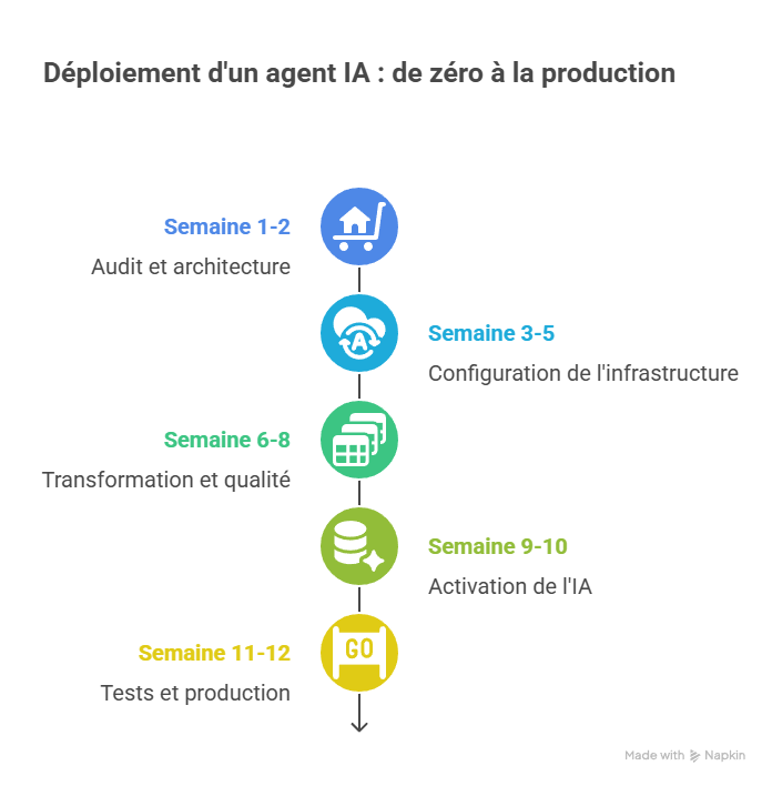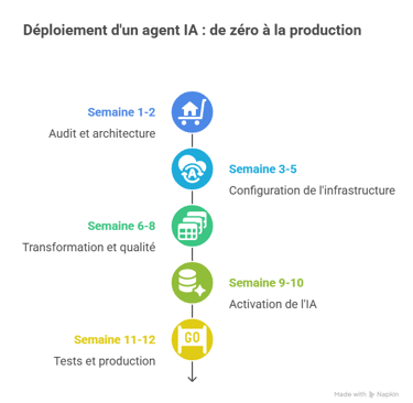 10 à 12 semaines : Premier agent IA en version beta (chatbot support interne, copilote SDR ou assistant closing). Testable par 10-15 utilisateurs internes pour récolter du feedback.