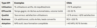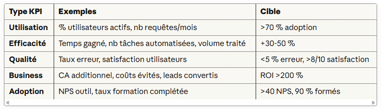 Définir KPIs de suivi (3-5 par projet) : utilisation, efficacité, qualité, business, adoption
