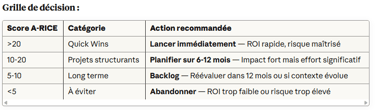 Sélectionner 2-3 projets pilotes Quick Wins (score A-RICE >20) pour démarrage immédiat