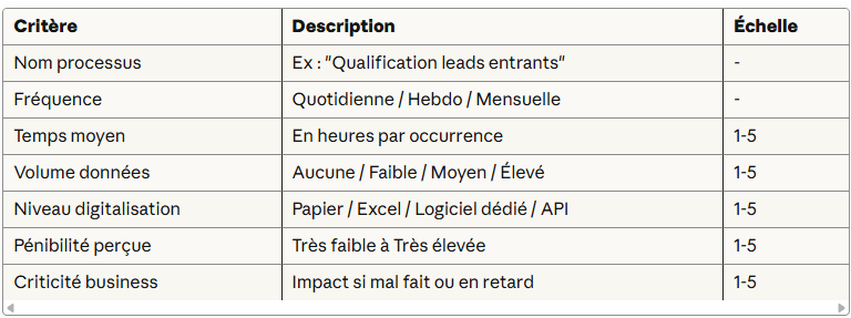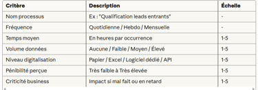Liste priorisée de 10-15 tâches automatisables identifiées avec scoring (volume, pénibilité, criticité)