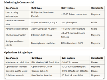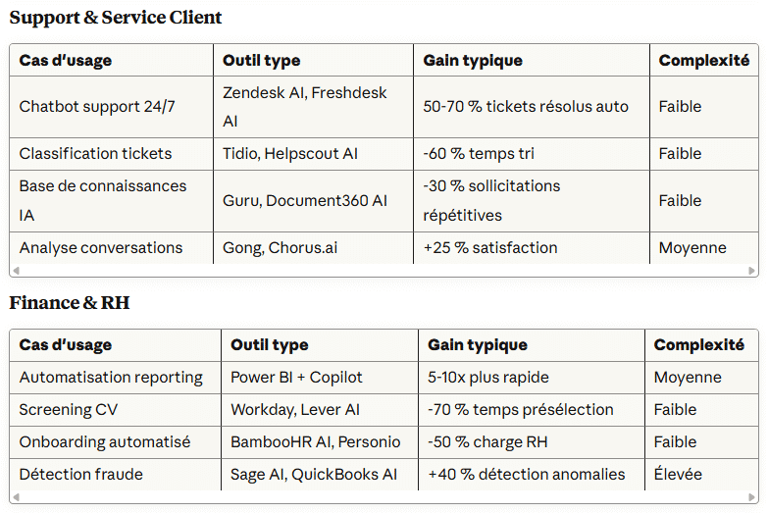 À partir de la cartographie Phase 1, identifiez les opportunités IA par grande fonction. Voici les cas d'usage les plus fréquents par métier :