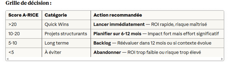 Vos ressources sont limitées. Votre temps, votre budget, votre capacité d'attention collective. Le framework A-RICE n'est pas un exercice théorique, c'est un outil de discipline stratégique. Il vous force à accepter une vérité inconfortable : 80 % de vos idées de projets IA doivent rester dans le backlog.